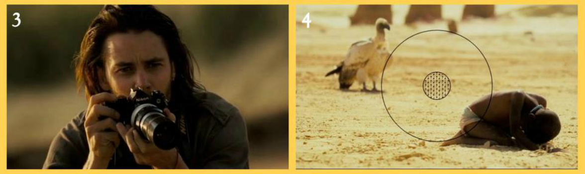 “As these children are so week and malnourished, to the viewer it may already seem that they are dead. A common feature of the fauna in this area are the vultures, who regularly look for any scraps that the humans leave behind. And so if you use a zoom lens, with a close-up of the boy and with the birds behind him, it gives the impression that they are going to eat him—but this is a complete illusion. The animal is perhaps twenty meters away from the child.” (Extracted from wikipedia)